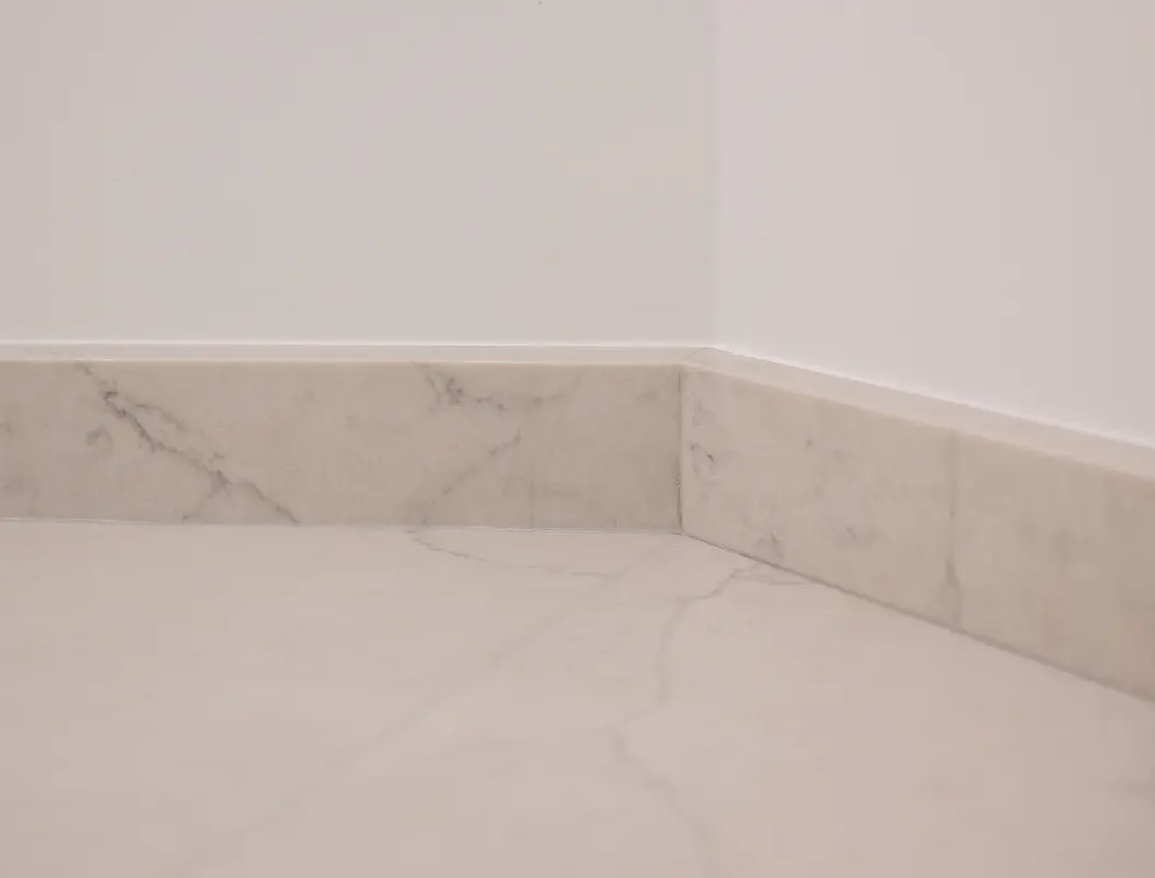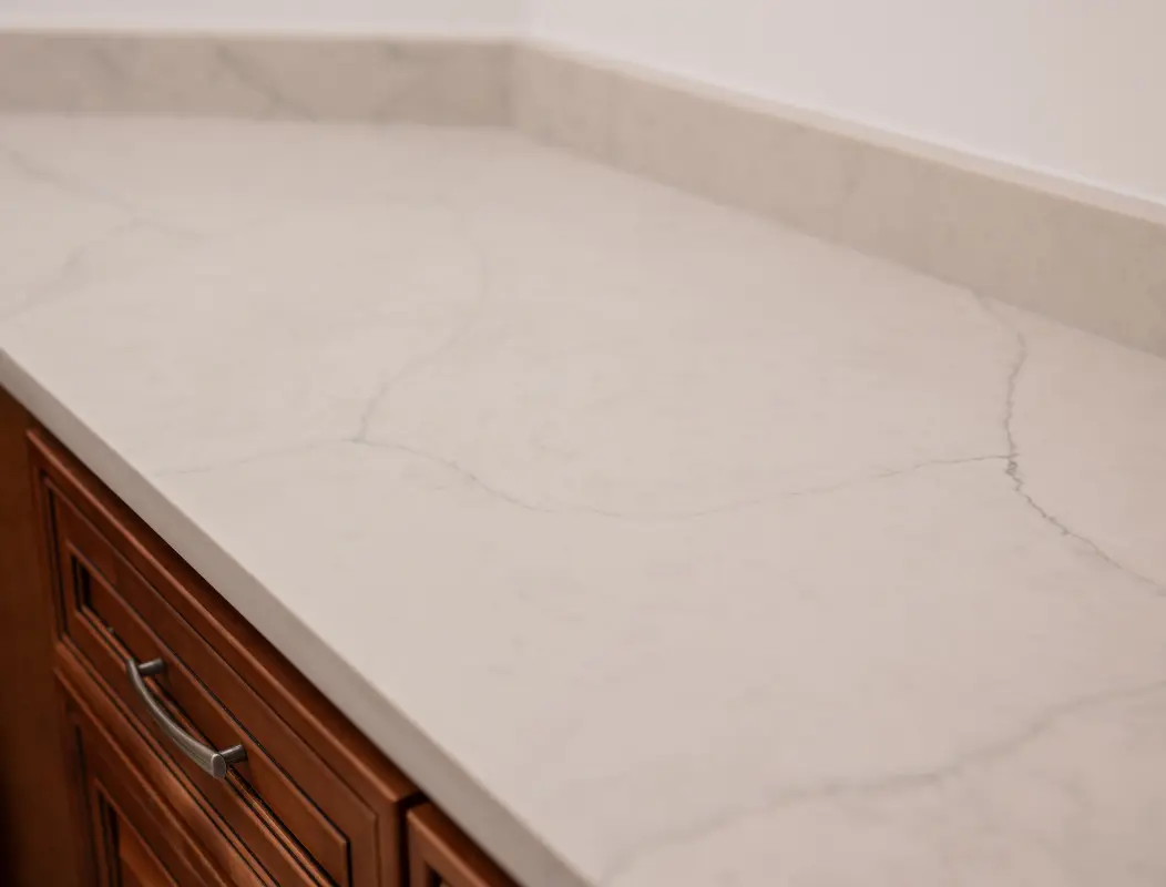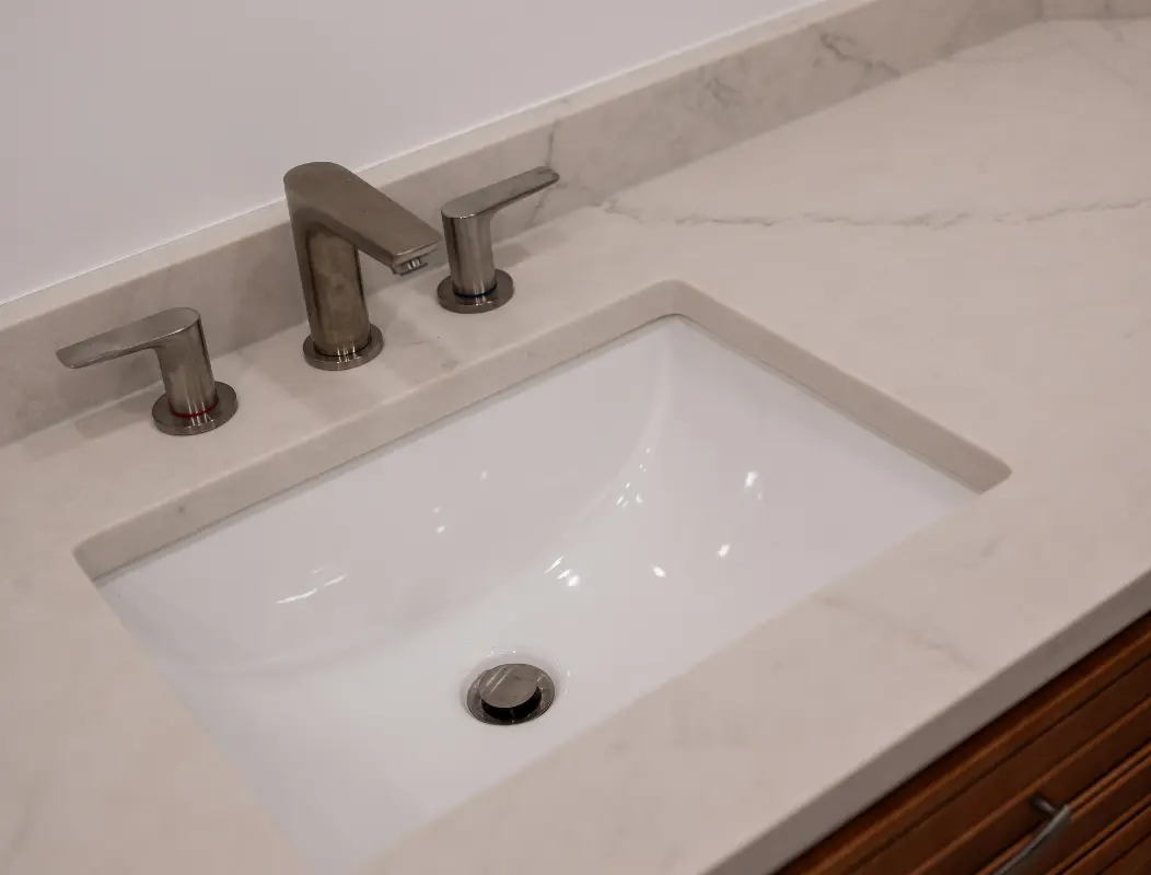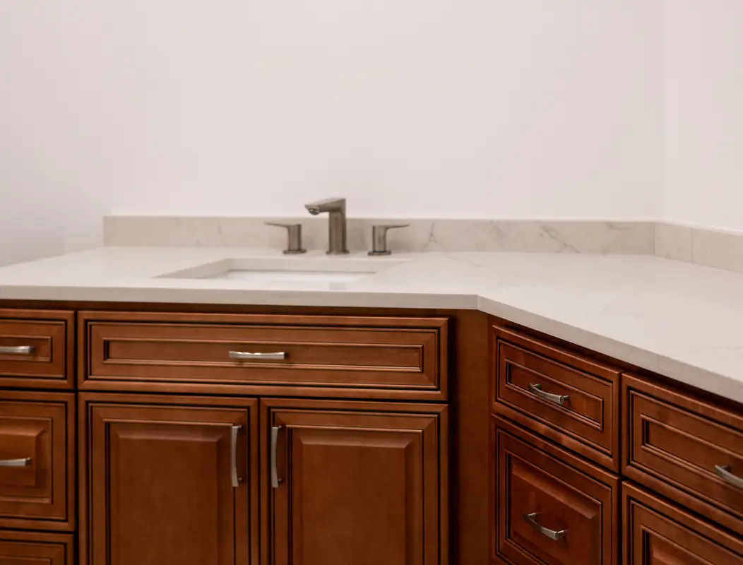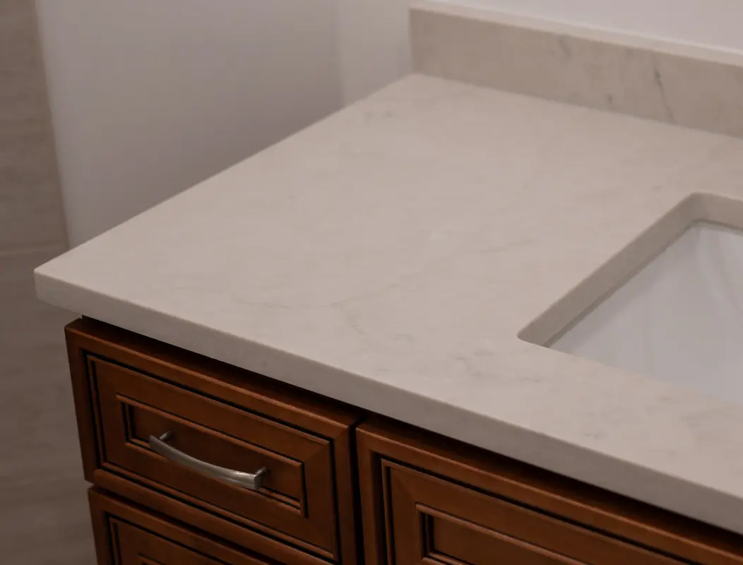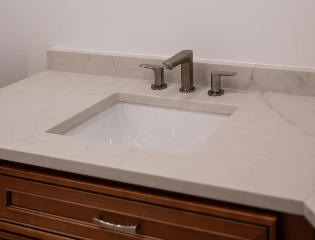 Our team then custom-cut the quartz slab, meticulously shaping the edges and sink cutouts to align perfectly with the vanity’s dimensions. Quartz was chosen not just for its beauty, but for its exceptional resilience — resisting stains, scratches, and moisture, making it ideal for a high-use area like the bathroom.